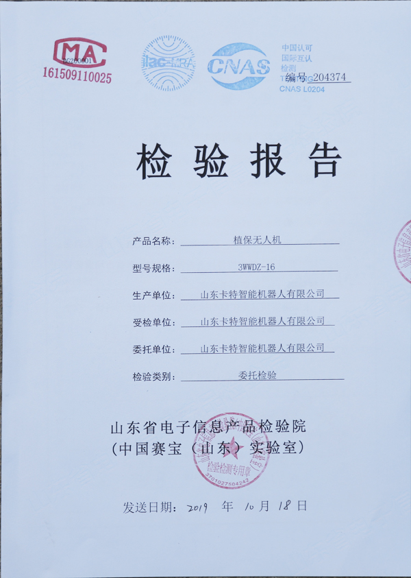 近日,中煤集团旗下山东卡特智能机器人有限公司最新研发产品——3WWDZ-16型“嘿客”植保无人机顺利通过山东省电子信息产品检验院(中国赛宝山东实验室)产品检验,所检外壳防护等级符合标准规定的要求,取得产品合格检测报告。