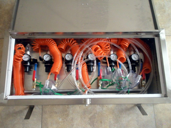 压风自救器一般形成系统后使用,即由若干组压风自救装置安装在同一个地点形成压风自救站,每组一般由3~5个头组成,每个地点装多少个头,应视该工作场所的工作人数而定,其安装头数应大于在该场所工作的人数。该装置系统结构简单,价格便宜,是一种经济型长久性自救装置系统。