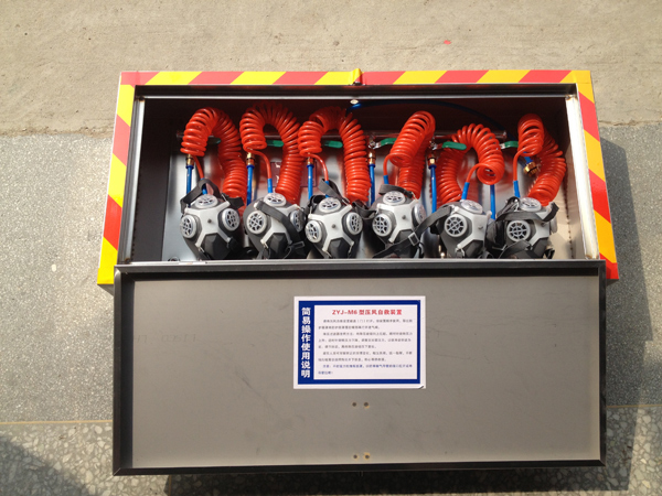 ZYJ矿井压风自救装置箱体结构是一种新型的隔绝式气体呼吸防护装置,针对传统老式压风自救装置存在的缺陷,本装置一箱六组,能同时提供六人使用,达到互相照顾的效果。ZYJ矿井压风自救装置由壳体、安装板、进气总管、挂钩、箱锁、都采取不锈钢制造而成。是当矿井下发生事故或出现有害气体工作人员不能正常呼吸时,为避灾而设定的一种自救装置。每组呼吸器单独配置减压过滤阀,过滤空气中的杂质、水气和油质、降低压风噪音、从而准确控制空气压力,使工人呼吸无阻碍、畅通舒适。采用轻型呼吸面罩直接带在嘴上进行呼吸,还具有稳定调节压力、手动流量调节、三级消音、过滤、排水、防尘等六种功能,还能在弹簧管范围内自由活动。通过该装置输送新鲜空气,使避灾人员能长时间呼吸轻松,达到安全避灾,稳定工作情绪的目的。它的供气一般采用矿井压风管路,对压风气体进行减压、消声、流量调节,过滤油水等功能,为工作人员提供清新的空气。本装置有安装方便,美观大方,使用寿命长,噪音低,空气清新卫生,不影响视线,人员可在一定的范围内工作活动等优点,较为理想中的一种矿用ZYJ压风自救装置。
