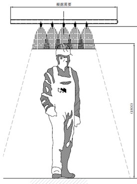 采用高吹扫力气体喷头,压力为0.6Mpa耗气量1.2m³/min有效喷射距离可达2至3米,形成60度气流锥角,实现有效喷淋清洗人体上的有毒气体并置换过渡室气体;