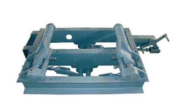 液压阻车器使用的阻轮式阻车器,有一对阻爪和弹簧缓冲装置,当车轮撞击阻爪时,阻爪使套在固定轴后部的弹簧压缩,撞击的能量便为弹簧吸收。阻爪的尾部通过连杆和操纵机构连接,液压缸活塞杆的往复运动使两个阻爪同时打开或关闭,关闭时阻车,打开后矿车即可通过。阻车器按线路设置可分为前、后阻车器两种。前阻车器作矿车限位之用,后阻车器用于列车限位,并与调车启爪装置机械联动,只有后阻车器打开时,拉车爪才抬起,调动矿车;后阻车器关闭时,拉车爪不抬起,推车机可顺利在矿车下面通过。