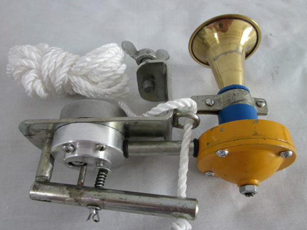风笛紧急制动阀,其主体为由阀体、两阀芯、导向板和驱动转柄构成的顺序开启阀门,在阀体一侧连接胶管,胶管的另一端接喇叭。设计要点在于顺序开启阀门的下口连接一个三通体,三通体两侧通口分别接有固定板及进气口连接件。风笛紧急制动阀具有双进气口结构可方便地安装于列车的中部车厢,既可保障气路的畅通,又可实现鸣笛和制动,使位于列车中部的调度员也能使用。