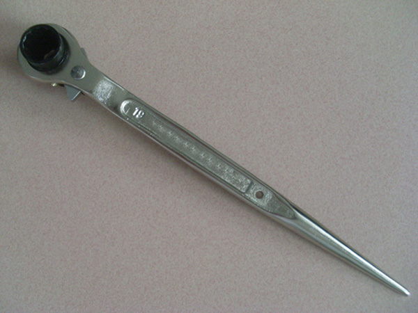 棘轮扳手是一种手动螺丝松紧工具,单头、双头多规格活动柄棘轮梅花扳手(固定孔的)。是由不同规格尺寸的主梅花套和从梅花套通过铰接键的阴键和阳键咬合的方式连接的。由于一个梅花套具有两个规格的梅花形通孔,使它可以用于两种规格螺丝的松紧,从而扩大了使用范围,节省了原材料和工时费用。活动扳柄可以方便地调整扳手使用角度。这种扳手用于螺丝的松紧操作,具有适用性强,使用方便和造价低的特点。