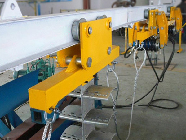 电缆单轨吊是用于煤矿综采工作面顺槽电缆、乳化液高压胶管和水管的吊挂与移动的专用运输装置。在综采工作面运输巷道一侧的顶板下,利用锚杆和链条吊挂悬空轨道,拖运车将所有电缆和高压胶管、水管都吊挂在上面,利用工作面乳化液泵站作动力,通过油缸和连杆组成的液压步进式推拉装置,实现电缆、高压胶管和水管沿着巷道吊挂和移动。该装置避免了井下电缆凌乱摆放,减少了电缆的占用空间与电缆的移动次数,避免了人工拖动电缆,极大地减少了工人的劳动强度和作业效率。