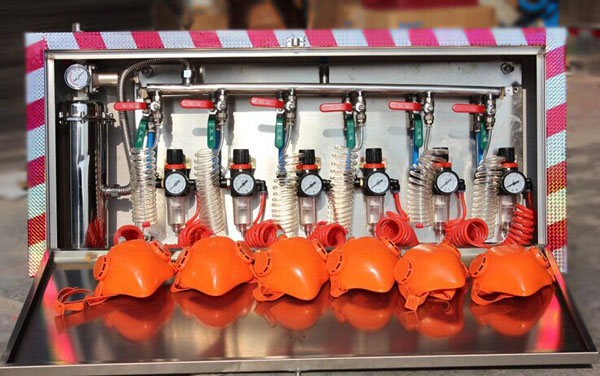 5、采用单向节流阀呼吸口具,外部有害气体不能进入;呼吸口具是根据矿井下特点专门设计的,口具上安装了单向阀,气体只能从口具向外排出,外部气体不能进入,了矿工的安全,而且不影响视线,人员可在一定的范围内活动。