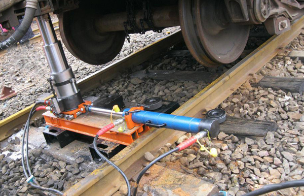 将掉道车辆进行举升然后再进行左右横移至复轨,由举升缸、横移缸、横移桥、横移小车、顶托和油泵组成。直顶横移型 复轨器举升油缸为三级液压油缸,油缸顶复点在车辆的车钩、中梁或者心盘,举升到一定的高度后,通过横移缸推动或者拉动一次完成车辆的掉道和救援起复作业。