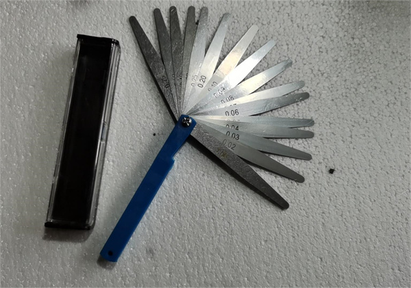 塞尺又称测微片或厚薄规,是用于检验间隙的测量器具之一,横截面为直角三角形,在斜边上有刻度,利用锐角正玄直接将短边的长度表示在斜边上,这样就可以直接读出缝的大小了。塞尺使用前必须先清除塞尺和工件上的污垢与灰尘。使用时可用一片或数片重叠插入间隙,以稍感拖滞为宜。测量时动作要轻,不允许硬插。也不允许测量温度较高的零件。