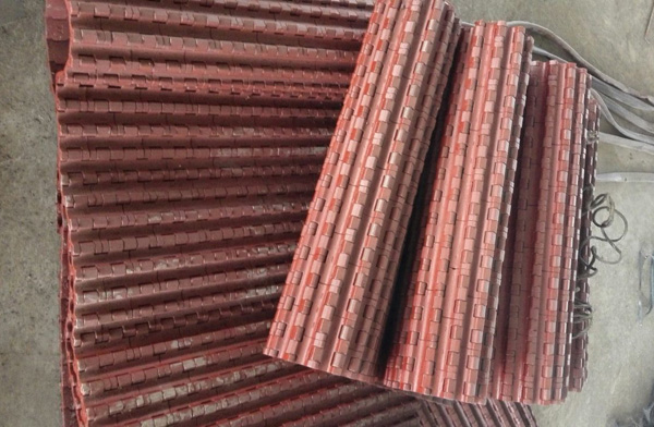 给煤机甲带又称钢带、履带,是甲带式给煤机传动部分中主要配件,甲带选用由增强尼龙高耐磨轴销串接新型甲片组成。新型甲片为精密铸造,材质为Mn16或高耐磨合金钢。Mn16材料具有良好的耐磨性、韧性,增强尼龙穿条具有良好的耐磨性和自润滑性,大大提高了甲带的耐冲击性,当甲带受到物料剧烈冲击时,首先其自身结构形式就将冲击力由冲击点甲片经甲带尼龙穿条向四周扩散,其次,其下的胶带自身变形也吸收一定的冲击载荷。并同时将剩余的冲击载荷传导给缓冲托辊及缓冲托辊座进行吸收,这样就很好的提高了给煤机的抗冲击力。