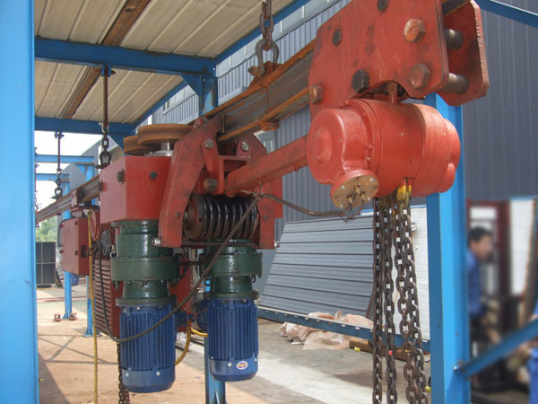 本产品是由电动葫芦、运输挂车、连接梁、牵引行走车、松闸液压站、轨道、吊挂组件、电控系统、数十辆挂缆小车部件组成。运行在柴油机或蓄电池单轨吊的迎头区段,机头由运输挂车、摩擦轮牵引行走弹力抱闸机构车、松闸液压站、矿用隔爆兼本质安全型电磁起动器及系列电缆挂车构成。煤矿用电动葫芦悬挂在电动葫芦挂车下方。使用矿用隔爆兼本质安全型无线遥控器操纵电动葫芦起重钩的升降和摩擦轮牵引车的往返行走。