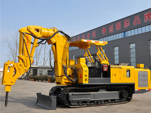 该机工作大臂可以左右摆动45°,大臂也可以旋转360°,同时配有前推铲,可以满足上顶板挖掘,侧邦挖掘和下部挖掘、破岩、装车、起吊等各项动作要求,实现挖掘毛水沟、卧底、破岩、清理浮煤、清理皮带机底部、平整巷道及小型配件吊装等多种功能作业,并具有体积小,机动灵活、安全高效等特点。