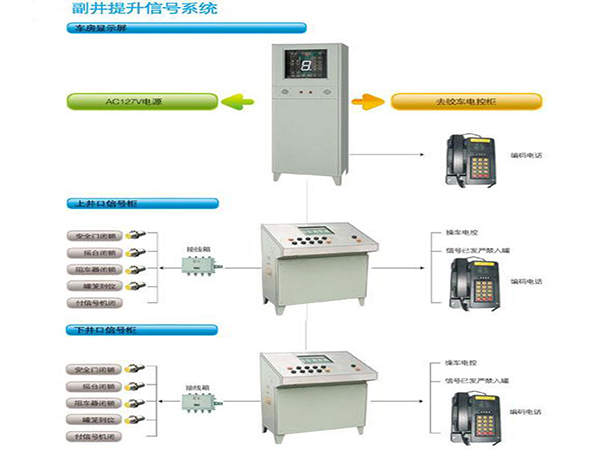 KXT19型矿用PLC多功能提升信号装置(以下简称“信号装置”)是由KXT19-F矿用提升信号装置车房显示箱、KXT19-X矿用本安型提升信号装置下井口信号箱、KXT19-S矿用本安型提升信号装置上井口信号箱和两台DXJ1-127煤矿用隔爆兼本安稳压电源箱及KXB15矿用本安型声光报警器(选配)组成。