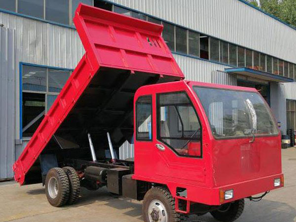 矿用四驱车的车厢分后向倾翻和侧向倾翻两种,通过操纵系统控制活塞杆运动,后向倾翻较普遍,推动活塞杆使车厢倾翻,少数双向倾翻。高压油经分配阀、油管进入举升液压缸,车厢前端有驾驶室安全防护板。