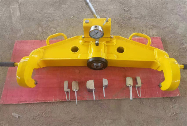 YJT-500液压尖轨直轨器作业时,将该机水平放置于尖轨或普通钢轨上,液压缸活塞杆的顶块对准尖轨或普通钢轨变形位置的轨腰中心处,钩轨臂钩紧另侧轨腰中心。搬动手压泵搬杆,活塞杆伸出,顶块顶紧轨腰,同时,两侧钩轨垫铁也钩紧轨腰,往复搬动手压泵搬杆,向液压油缸供油,系统压力增高,活塞杆及顶块推力加大,在两侧钩轨臂的支承下,尖轨或普通钢轨产生变形,直至产生塑性变形,将尖轨或普通钢轨调直或弯曲。
