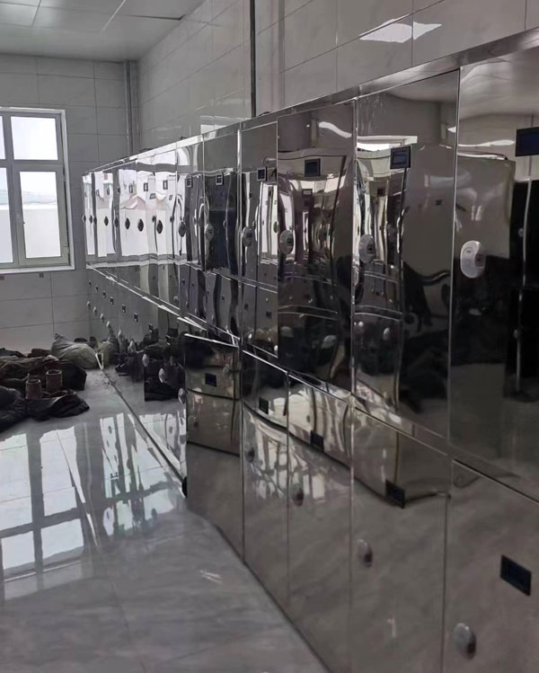 矿用智能更衣柜柜体使用冷轧钢板,表面采用环氧树脂阻燃嗦粉末喷塑,无明火,无有毒气体。柜体内具有通风模组,可以达到恒温控制的效果,加装风机,使柜体内空气流动带出湿气;衣柜门锁支持刷卡开锁、主控板一键开锁、虹膜开锁(选配)