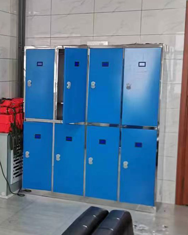 矿用浴室智能更衣储物柜柜体使用冷轧钢板,表面采用环氧树脂阻燃嗦粉末喷塑,无明火,无有毒气体。柜体内具有通风模组,可以达到恒温控制的效果,加装风机,使柜体内空气流动带出湿气;衣柜门锁支持刷卡开锁、主控板一键开锁、虹膜开锁(选配)