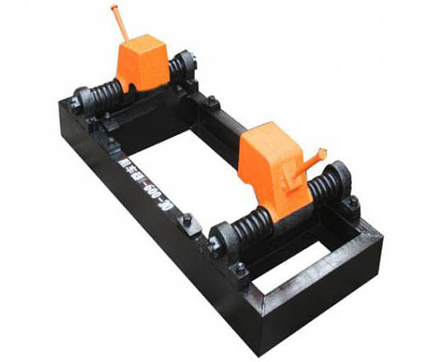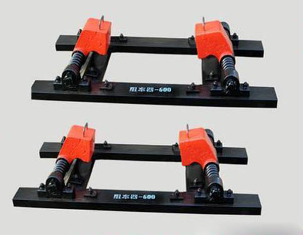 双轨阻车器由两根平行的固定支座和阻车杆、前支承座、后支承座及脚踏连动装置组成