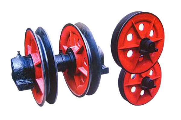 1)双槽悬吊天轮和单槽悬吊天轮的结构主要有绳轮、固定轴、及轴承座组成。