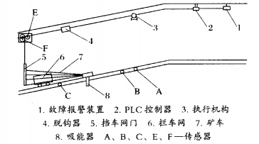 整个系统工作过程:当有矿车下行时,传感器A、B将矿车下行越过它们的时间信号传递给PLC控制器, PLC控制器将完成矿车速度是否正常的判断。若矿车 速度在正常的速度范围内,PLC控制器将控制电机正 转完成上提拦车网门操作;拦车网门上提到位后,传感器E将发出上提到位信号,PLC控制器将控制电机停止旋转;当矿车下行越过传感器c后,传感器c将发出矿车下行通过拦车门的信号,PLC控制器将控制电机反转放下 拦车网门,放到位后传感器F将发出下放到位信号, PLC控制器控制电初停转,使门处于常闭状态;当矿 车下行的速度超出正常工作速度或矿车脱轨时, PLC控制器将控制电机不工作,处于常闭状态的拦车 网门将矿车拦住,保障了斜井下部设备和人员的安全。当矿车上行越过C后,传感 器c将发出矿车上行 信号,PLC控制器接到信号后,控制电机上提拦网门;矿车过了B传感器后,B传感器将发出上行矿车越过拦网门信号,PLC控制器控制电机放下拦网门,完成一个循环。