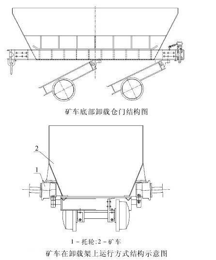 2、底卸式矿车本体在卸载架上的运行方式设计为托轮承载式。利用斜巷运输矿车的自身重力在巷道方向的分力,沿承载轮缓慢运行,而车轮在自身重力作用下沿曲轨运行,使前后仓门依次打开,实现矸石的卸载。