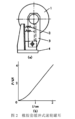 图3(a)是碟簧缓冲式滚轮罐耳,其结构与橡胶套缓冲式滚轮罐耳基本相同。它主要由聚胺脂滚轮1、碟簧2、活动臂3和固定座4组成。