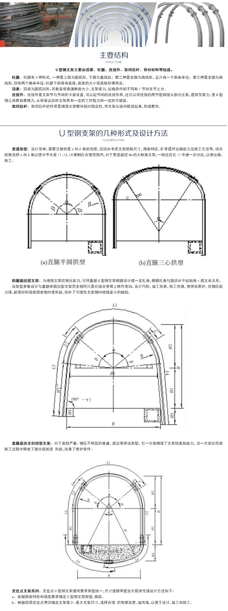 U型钢支架是—种横截面形状像英文字母“U”的钢铁。各国生产的u型钢的断面形状、几何参数以及材质等有所不同,目前中国生产的U型钢型号主要有U18、U25、129、U36这四种。其中u18和U25属腰定位;U29、U36属耳定位。U18由于承载能力很低,现很少生产。