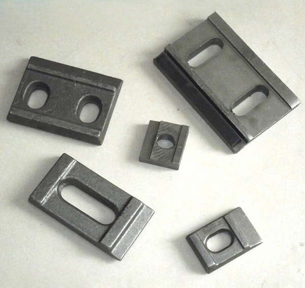 轨道压板是由基座、压头、压舌、螺栓(8.8S)、螺母(8H)及扣紧螺母组成。 轨道压板是为起重机钢轨与地面(或承载梁)进行可靠固定的联接件,它沿轨道全长布置,每隔500mm设置一组,一组为二付,对称布景在轨道二侧,在起重机运行状态下,它能随垂直和侧向冲击力,并能承受起重机歪斜运行所产生的附加侧向力。