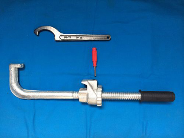 钩锁器一般分为普通道岔钩锁器和交分道岔钩锁器钩锁器由主钩、副钩、粗调定位挡铁组成,粗调定位挡铁的外侧增加了一个微调锁定螺母和一个钩扳手;主钩的钩头有两个大小不同的双齿。钩尾有一个纵向滑槽和一个横向挡位槽,粗调定位挡铁的外侧有与微调锁定螺母相配合的螺纹。