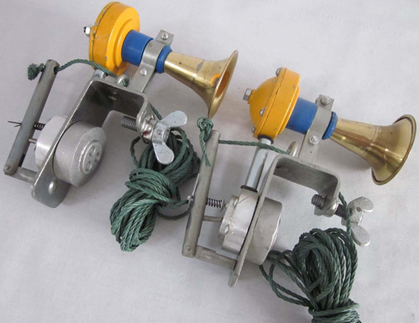 风笛紧急制动阀,其主体为由阀体、两阀芯、导向板和驱动转柄构成的顺序开启阀门,在阀体一侧连接胶管,胶管的另一端接喇叭。设计要点在于顺序开启阀门的下口连接一个三通体,三通体两侧通口分别接有固定板及进气口连接件。风笛紧急制动阀具有双进气口结构可方便地安装于列车的中部车厢,既可保障气路的畅通,又可实现鸣笛和制动,使位于列车中部的调度员也能使用。