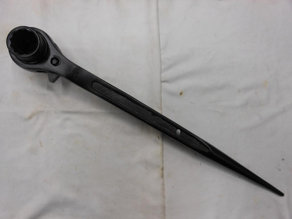 一用于旋转置于狭窄或难于接近的位置的螺栓或螺母的棘轮扳手,棘轮扳手与操作杆端部可旋转地连接。棘轮扳手包含:一与操作杆相连接的重块,重块可沿操作杆的长度方向滑动,在所说重块前部的操作杆上具有挡住重块冲撞的前部重块承载部分。或者,在所说重块后部的操作杆上具有挡住重块冲撞的后部重块承载部分。而且,操作杆上还可以既具有前部重块承载部分又具有后部重块承载部分。