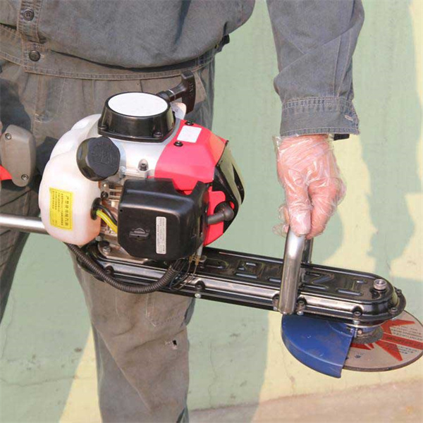 3、启动汽油机,空载运行不少于30秒,一手握住前扶手,一手握住后扶手,内燃机预热平稳后,逐渐加大油门,若无异常响动,设备运行平稳后再进行打磨。