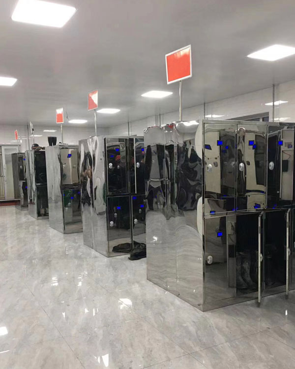 矿用智能更衣柜柜体使用冷轧钢板,表面采用环氧树脂阻燃嗦粉末喷塑,无明火,无有毒气体。柜体内具有通风模组,可以达到恒温控制的效果,加装风机,使柜体内空气流动带出湿气;衣柜门锁支持刷卡开锁、主控板一键开锁、虹膜开锁