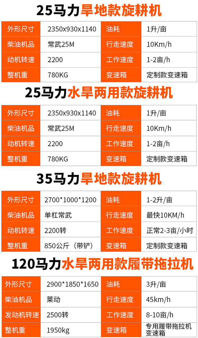 旋耕机一机多用,应用广泛,可应用于丘陵、果园、平原、旱地、荒地、大棚等空间。农具齐全可搭配开沟机、除草机、回填机、推土铲等配件,实现一台机器完成多种农耕需求。