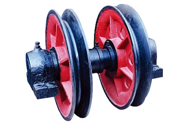 1)双槽悬吊天轮和单槽悬吊天轮的结构主要有绳轮、固定轴、及轴承座组成。
