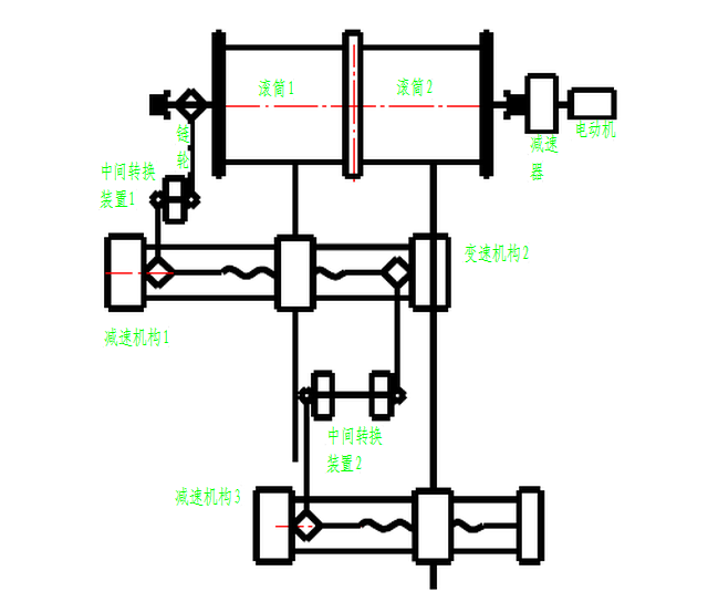 工作时通过把链轮安装在刹车滚筒上,在此取得动力源,让型号为12A的链带动链轮,再通过中间转换装置(1)和减速机构(1)传递到丝杠上,能够使得在滚筒旋转一周的情况下,丝杠能够旋转一个绳距即20毫米。为保证准确的传动比和机构的便于安装,排绳装置(2)的动力来源于排绳装置(1)的丝杠,通过变速机构(2)使速度还原,再通过链轮经中间装换装置(2)和减速机构(3)使丝杠旋转。