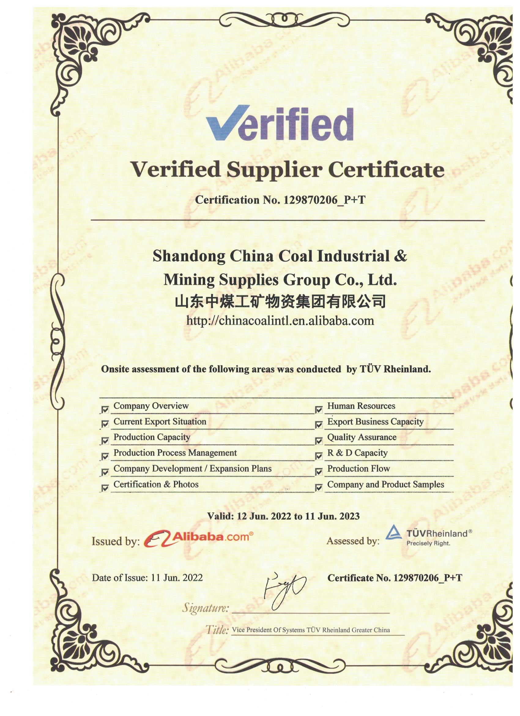 自阿里巴巴于2012年年初推出企业实地认证服务,山东中煤工矿物资集团有限公司当即向阿里巴巴提交了验厂申请,随后阿里巴巴委托GIS认证机构派专家组对山东中煤工矿物资集团有限公司进行了专项审核。经过专家组认真而严格的审核,山东中煤工矿物资集团有限公司在生产能力、研发能力、贸易能力、进出口能力、质量体系等方面全都达到了一流企业标准。专家组一致认为:“山东中煤工矿物资集团有限公司工厂有10多年来的矿用设备生产制造经验,产品认证多,资质深;对客户投诉与抱怨反应迅速,有专门的客服团队,客户投诉与抱怨处理基本24小时内能得到处理。工厂大力发展电子商务销售平台,拥有专业的电子商务销售团队,该平台已成熟运转5年多,并呈逐年递增趋势。——载录自认证报告原文”本次认证意味着山东中煤工矿物资集团有限公司真正地成为了国内外工矿机械产品生产制造行业的佼佼者,并具有了与国际知名品牌企业同台竞技的资本。以下为报告截图: